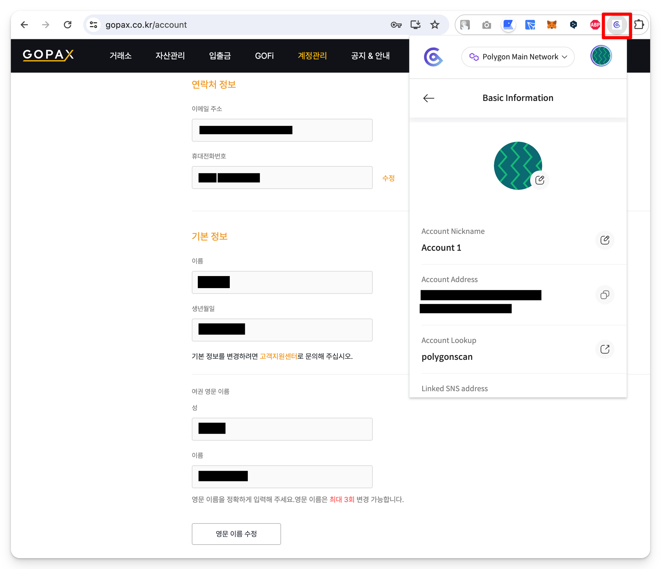 고팍스 [ 계정관리 ] 화면으로 접속합니다.