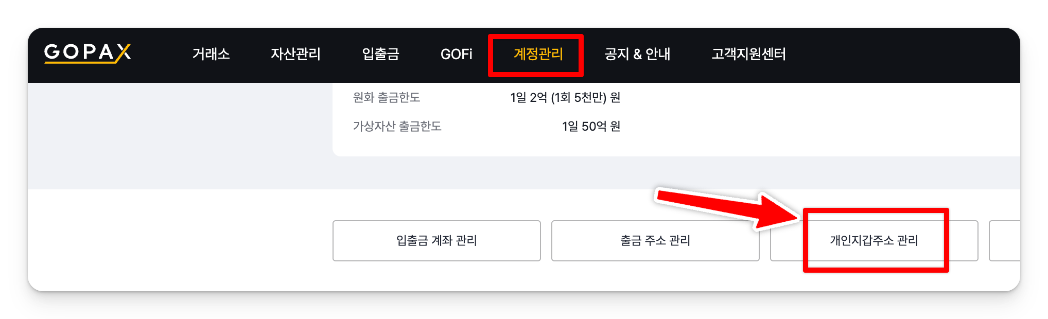 고팍스 로그인 후, 상단 [ 계정관리 ] > [ 개인 지갑주소 관리 ] 메뉴를 클릭합니다.